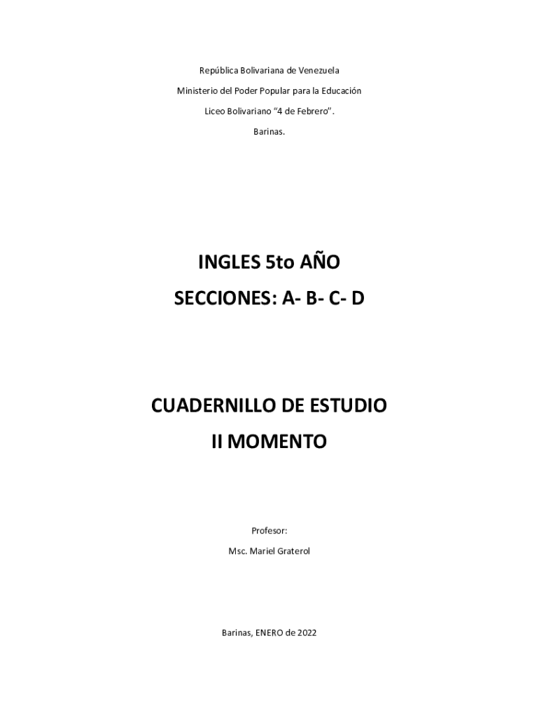 Replica Bolivarian de Venezuela Minister del Power Popular para la Education Lice Bolivarian 4 de Ferraro. Marinas.SINGLES 5to AO SECTIONS: A B C DCUADERNILLO DEE STUDIO II MOMENTOProfesor: MSC. Mariel