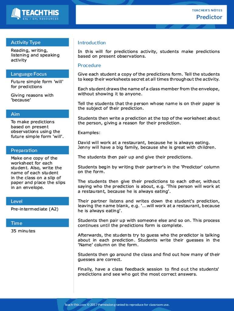TEACHER\'S NOTESPredictorESL / EFL RESOURCESActivity TypeIntroductionReading, writing, listening and speaking activity In this will for predictions activity, students make predictions based on present