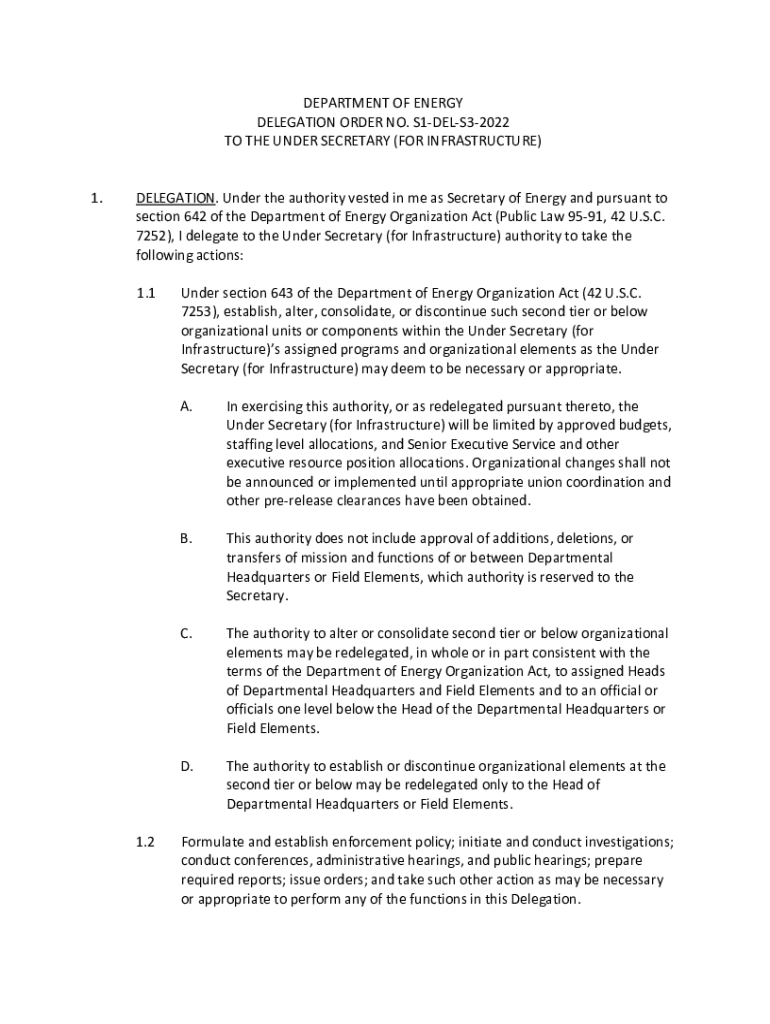 DEPARTMENT OF ENERGY DELEGATION ORDER NO. S1DELS32022 TO THE UNDER SECRETARY (FOR INFRASTRUCTURE) 1.DELEGATION. Under the authority vested in me as Secretary of Energy and pursuant to section 642