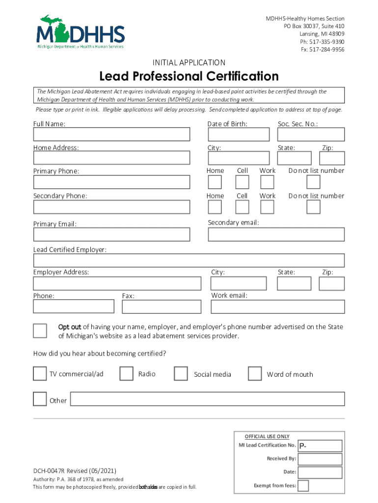 MDHHSHealthy Homes Section PO Box 30037, Suite 410 Lansing, MI 48909 pH: 5173359390 FX: 5172849956INITIAL APPLICATIONLead Professional Certification The Michigan Lead Abatement Act requires individuals