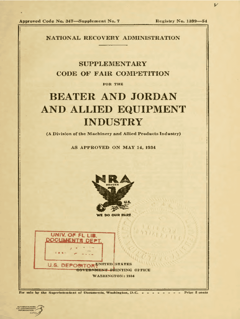 Registry No. 139954Approved Code No. 347Supplement No. 7NATIONAL RECOVERY ADMINISTRATIONSUPPLEMENTARY CODE OF FAIR COMPETITION FOR THEATER AND JORDAN AND ALLIED EQUIPMENT INDUSTRY (A Division of the
