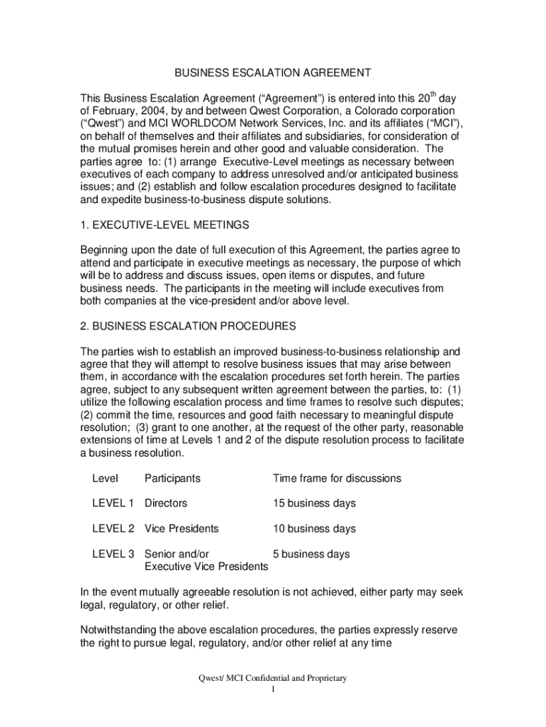 Get the free BUSINESS ESCALATION AGREEMENT This Business Escalation ...