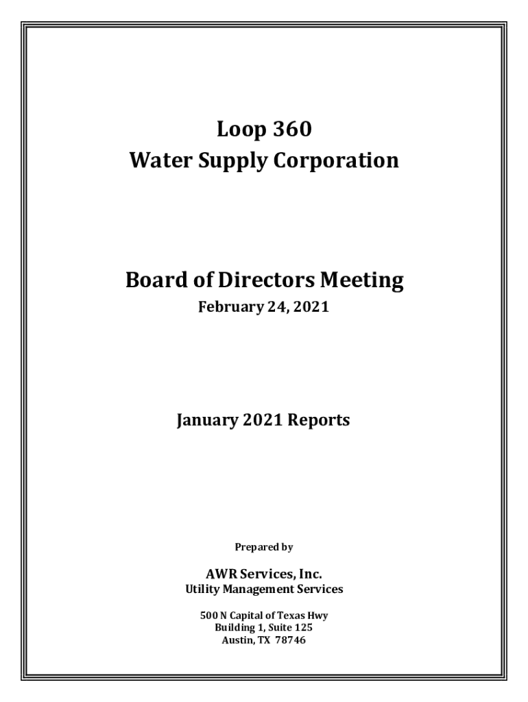 Loop 360 Water Supply CorporationBoard of Directors Meeting February 24, 2021January 2021 ReportsPrepared by AWR Services, Inc. Utility Management Services 500 N Capital of Texas Hwy Building 1, Suite