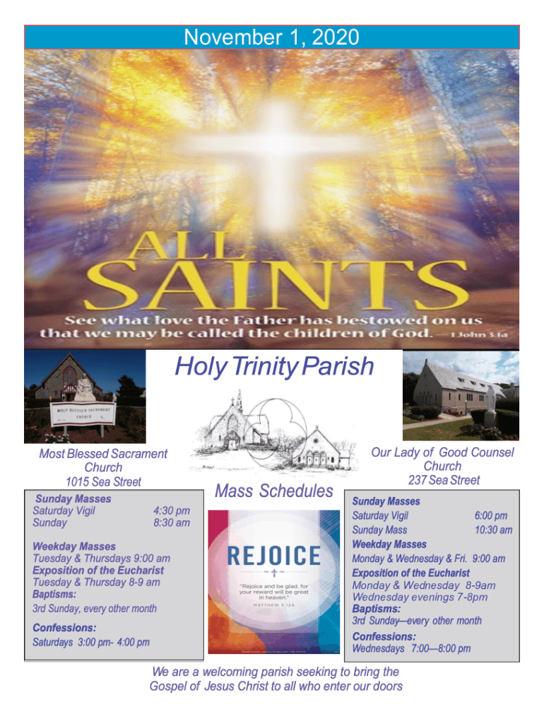 November 1, 2020Monday & Wednesday 89am Wednesday evenings 78pmEmail: holytrinityquincyma@gmail.comMost Blessed Sacrament Church will have Eucharistic Adoration from 8am8pm (9am Mass) on Nov. 3. Unite