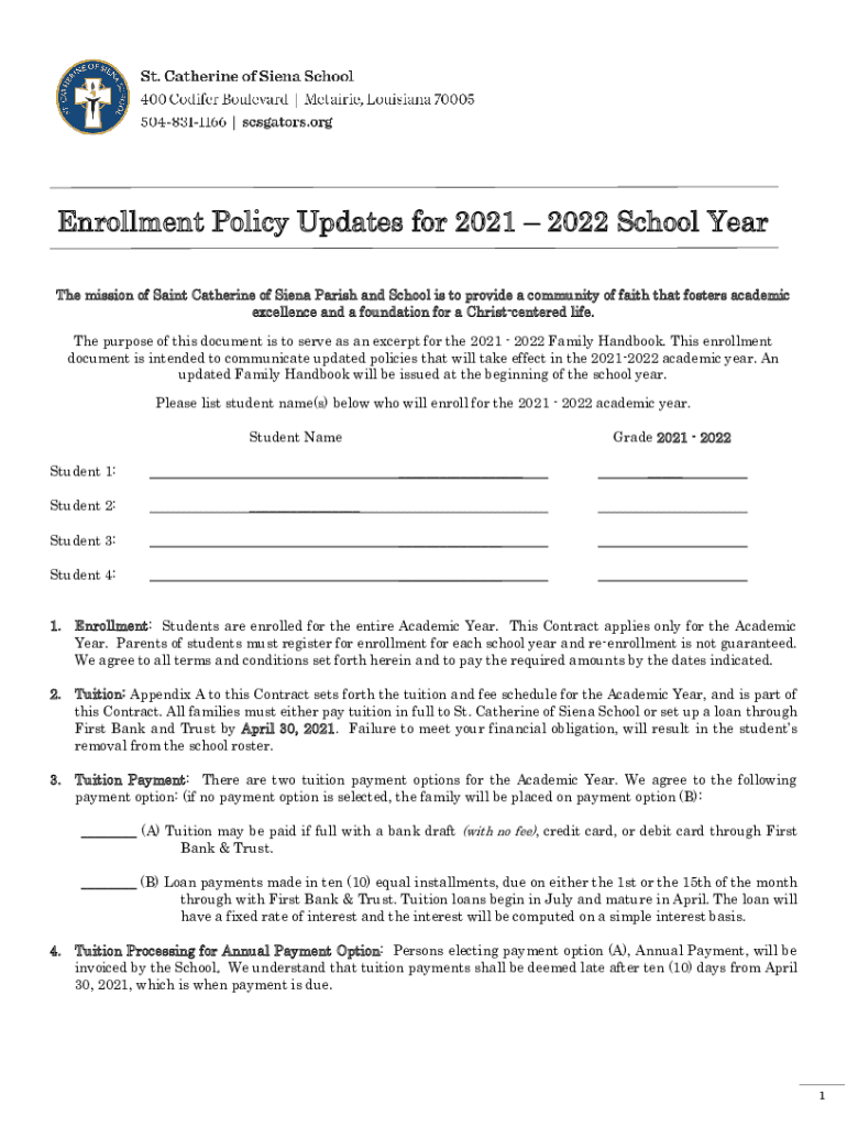 Enrollment Policy Updates for 2021 2022 School Year The mission of Saint Catherine of Saint Parish and School is to provide a community of faith that fosters academic excellence and a foundation for