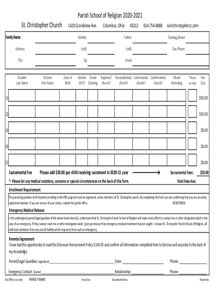 Parish School of Religion 20202021 St. Christopher Church1420 Grandview Ave. Family Name: Address: City:Student Last NameStudent First Name Date of Birth Columbus, Ohio432126147548888saintchristophercc.commuter:Father:Evening