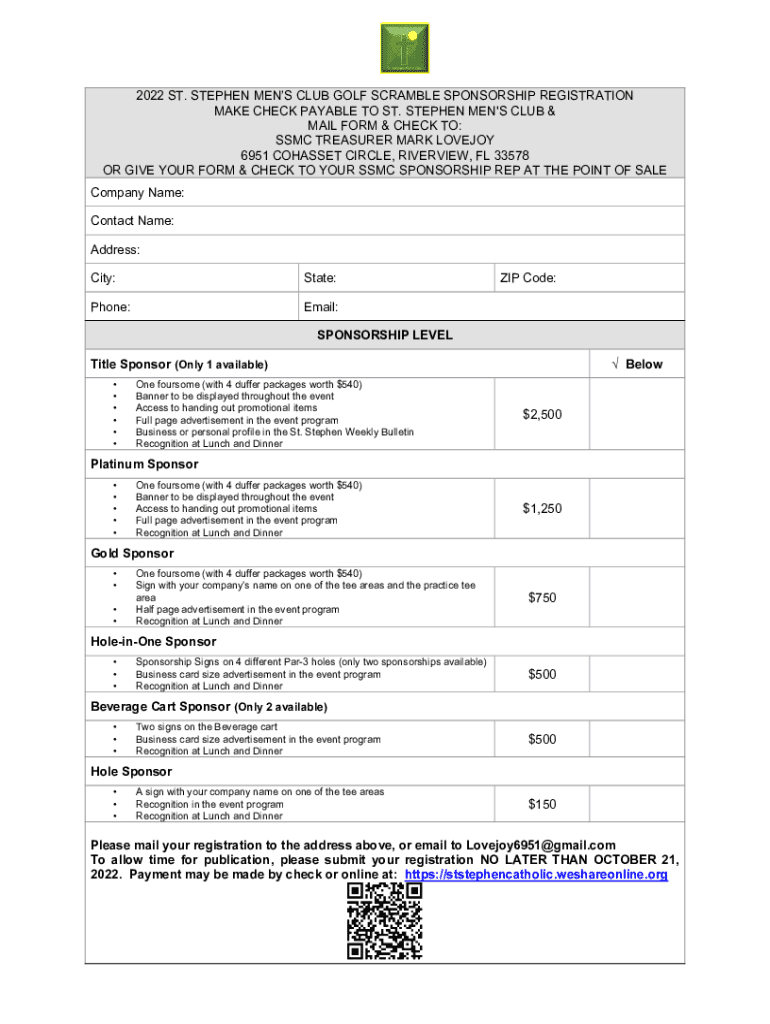 2022 ST. STEPHEN MEN CLUB GOLF SCRAMBLE SPONSORSHIP REGISTRATION MAKE CHECK PAYABLE TO ST. STEPHEN MEN\'S CLUB & MAIL FORM & CHECK TO: USMC TREASURER MARK LOVELY 6951 COSSET Circles, RIVERVIEW, FL