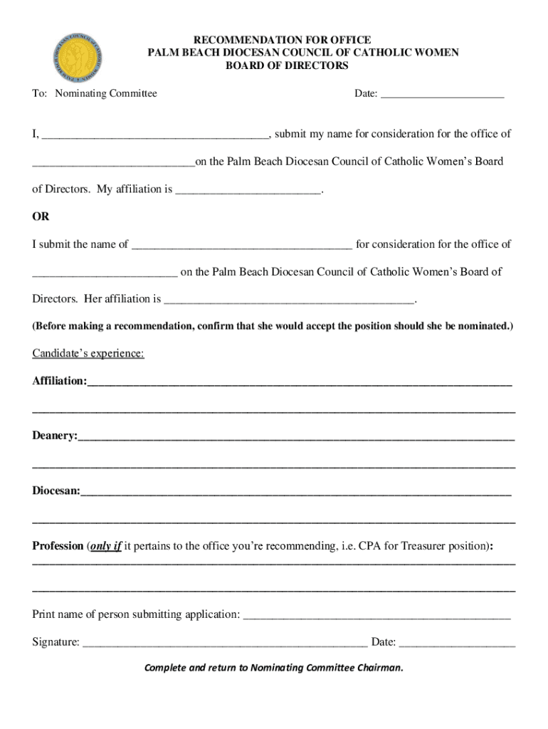 RECOMMENDATION FOR OFFICE PALM BEACH DIOCESAN COUNCIL OF CATHOLIC WOMEN BOARD OF DIRECTORS To: Nominating Committeeman: ___I, ___, submit my name for consideration for the office of ___on the Palm
