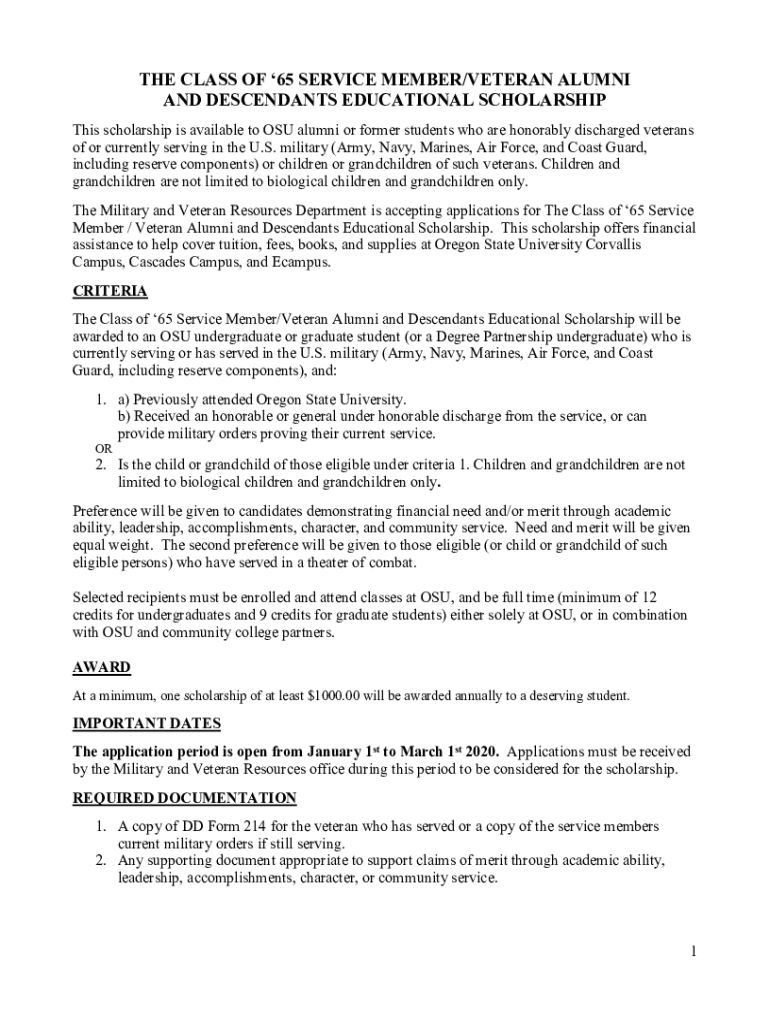 THE CLASS OF 65 SERVICE MEMBER/VETERAN ALUMNI AND DESCENDANTS EDUCATIONAL SCHOLARSHIP This scholarship is available to OSU alumni or former students who are honorably discharged veterans of or currently