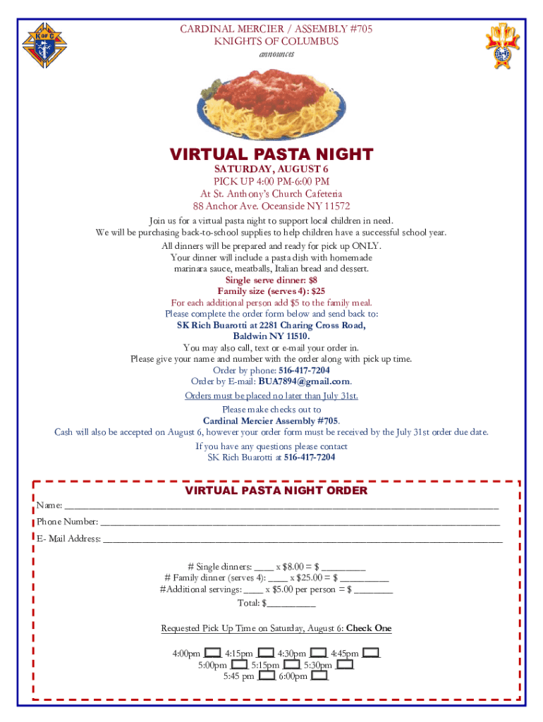 CARDINAL MERCIER / ASSEMBLY #705 KNIGHTS OF COLUMBUS announcesVIRTUAL PASTA NIGHT SATURDAY, AUGUST 6 PICK UP 4:00 PM6:00 PM At St. Anthony's Church Cafeteria 88 Anchor Ave. Oceanside NY 11572Join