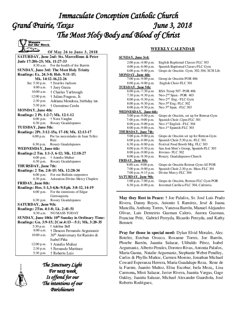 Immaculate Conception Catholic Church Grand Prairie, Texas June 3, 2018, The Most Holy Body and Blood of Christ Of May 26 to June 3, 2018, SATURDAY, June 2nd: St's. Marcellus & Peter Jude 17:20b25;