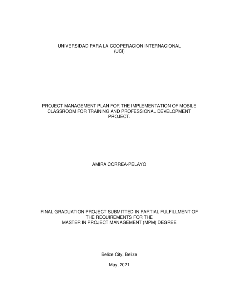 UNIVERSITY PARA LA COOPERATION INTERNATIONAL (UCI)PROJECT MANAGEMENT PLAN FOR THE IMPLEMENTATION OF MOBILE CLASSROOM FOR TRAINING AND PROFESSIONAL DEVELOPMENT PROJECT.AMIGA CORREAPELAYOFINAL GRADUATION