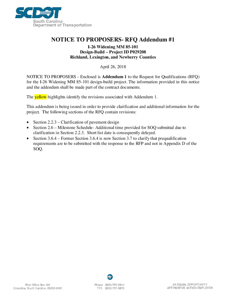 NOTICE TO PROPOSERS RFQ Addendum #1 I26 Widening MM 85101 DesignBuild Project ID P029208 Richland, Lexington, and Newberry Counties April 26, 2018, NOTICE TO PROPOSERS Enclosed is Addendum 1 to the