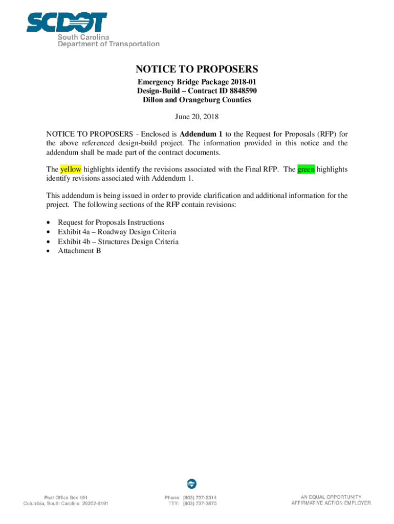 NOTICE TO PROPOSERS Emergency Bridge Package 201801 DesignBuild Contract ID 8848590 Dillon and Orange burg Counties June 20, 2018, NOTICE TO PROPOSERS Enclosed is Addendum 1 to the Request for Proposals