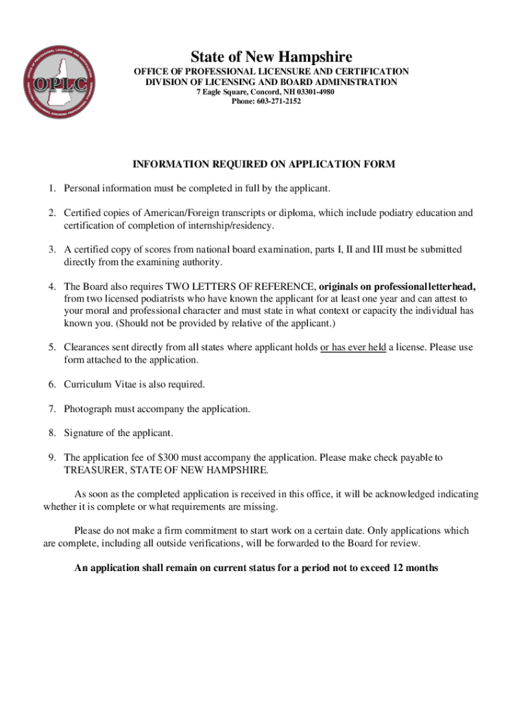 State of New Hampshire OFFICE OF PROFESSIONAL LICENSURE AND CERTIFICATION DIVISION OF LICENSING AND BOARD ADMINISTRATION 7 Eagle Square, Concord, NH 033014980 Phone: 6032712152INFORMATION REQUIRED