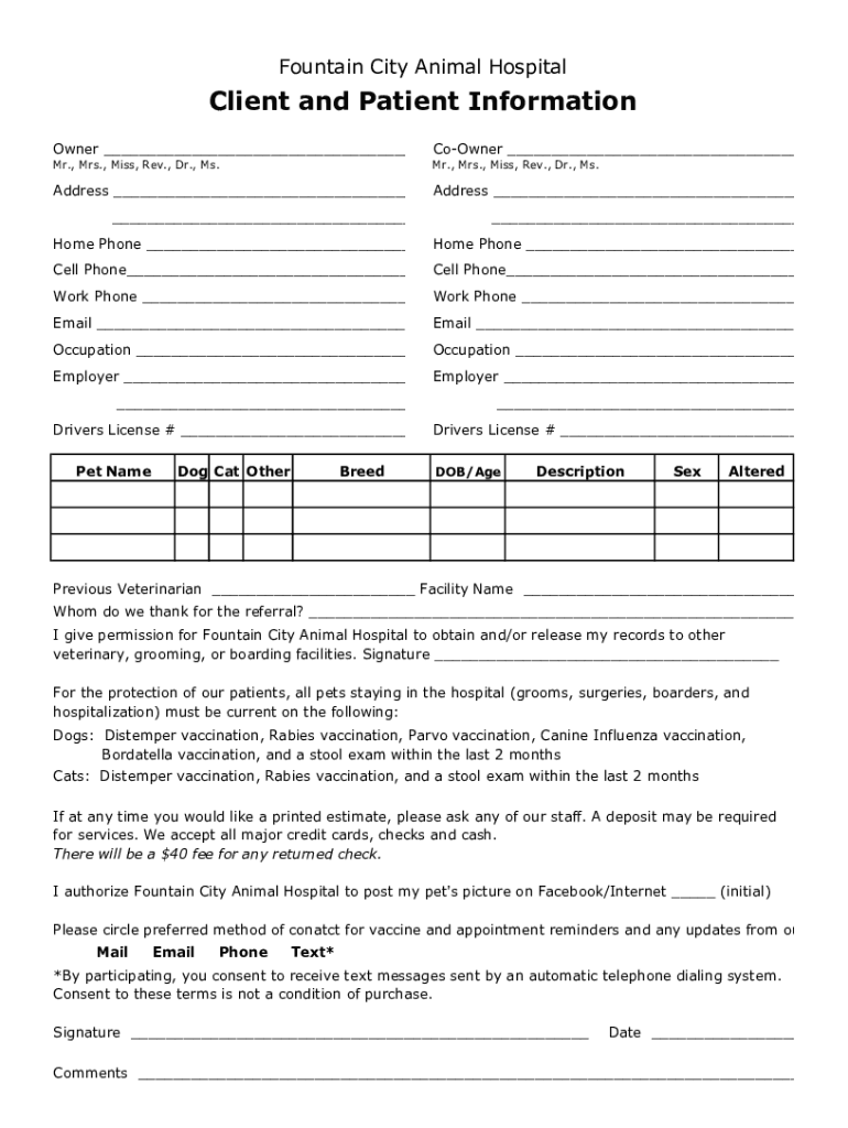 Fountain City Animal HospitalClient and Patient Information Owner ___Corner ___Mr., Mrs., Miss, Rev., Dr., Ms. Mr., Mrs., Miss, Rev., Dr., Ms. Address ___Address _________Home Phone ___Home Phone