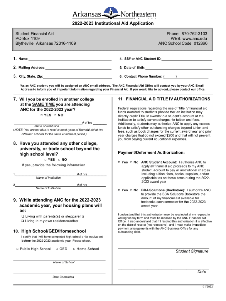 20222023 Institutional Aid Application Student Financial Aid PO Box 1109 Blytheville, Arkansas 723161109Phone: 8707623103 WEB: www.anc.edu ANC School Code: 0128601. Name :4. SS# or ANC Student ID:2.