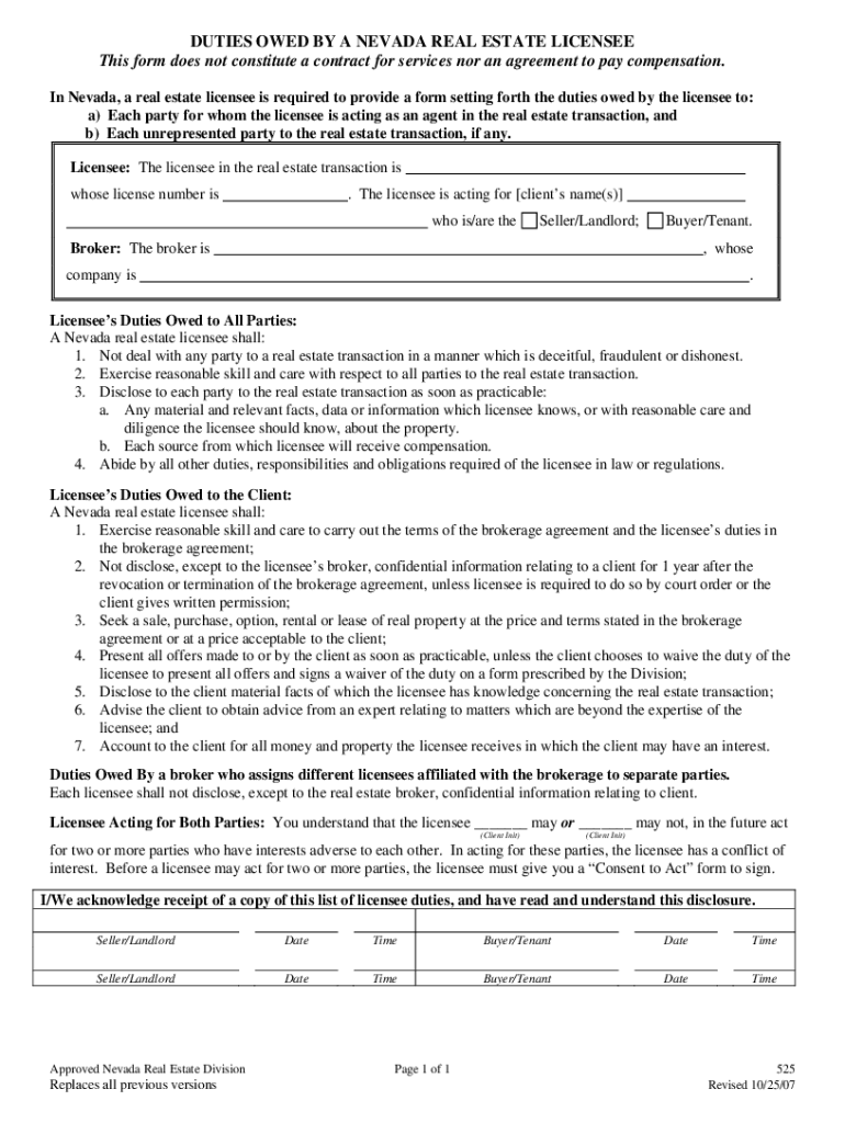 DUTIES OWED BY A NEVADA REAL ESTATE LICENSEE This form does not constitute a contract for services nor an agreement to pay compensation. In Nevada, a real estate licensee is required to provide a