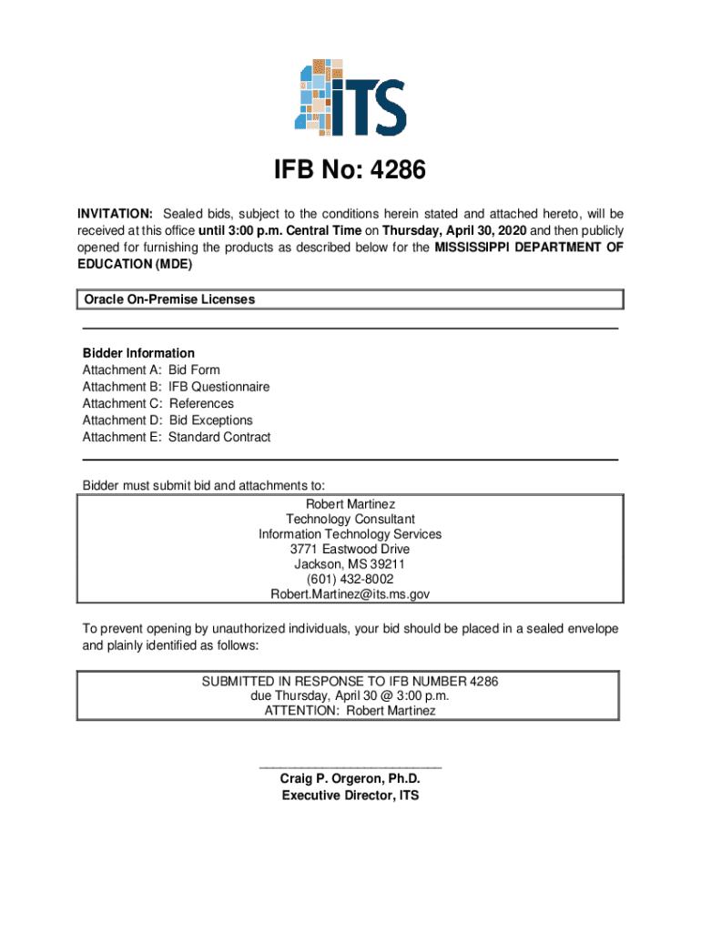 IF No: 4286 INVITATION: Sealed bids, subject to the conditions herein stated and attached hereto, will be received at this office until 3:00 p.m. Central Time on Thursday, April 30, 2020, and then