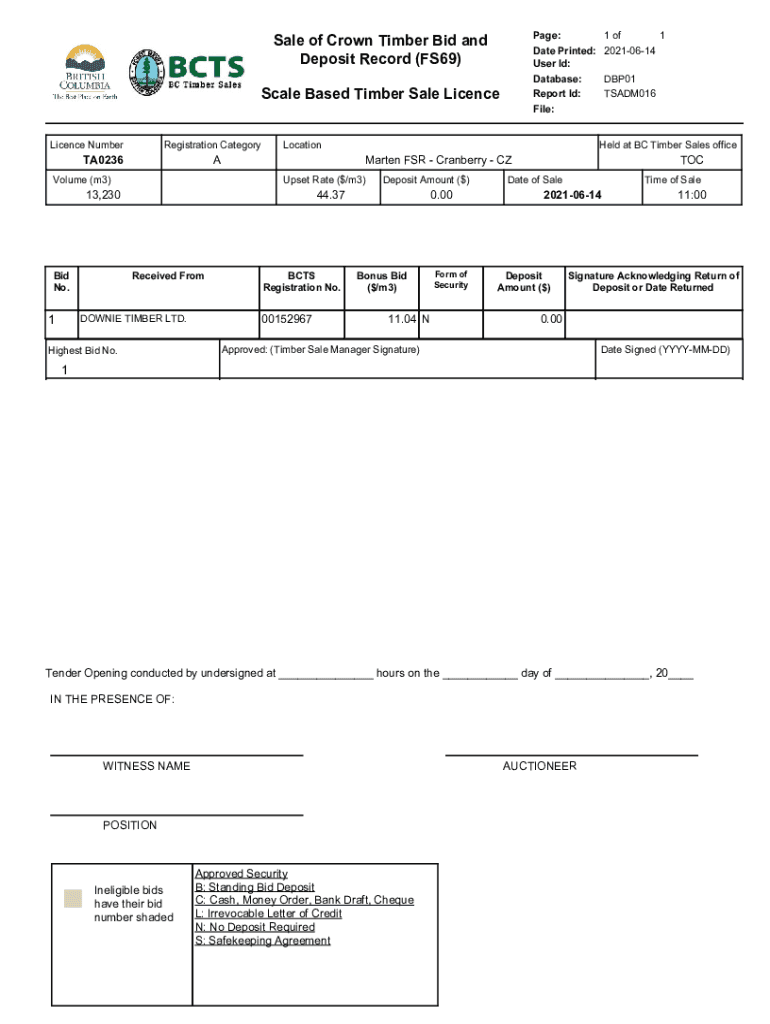 Page: Date Printed: User I'd: Database: Report I'd: File:Sale of Crown Timber Bid and Deposit Record (FS69) Scale Based Timber Sale License NumberRegistration CategoryTA0236LocationAVolume (m3)Deposit