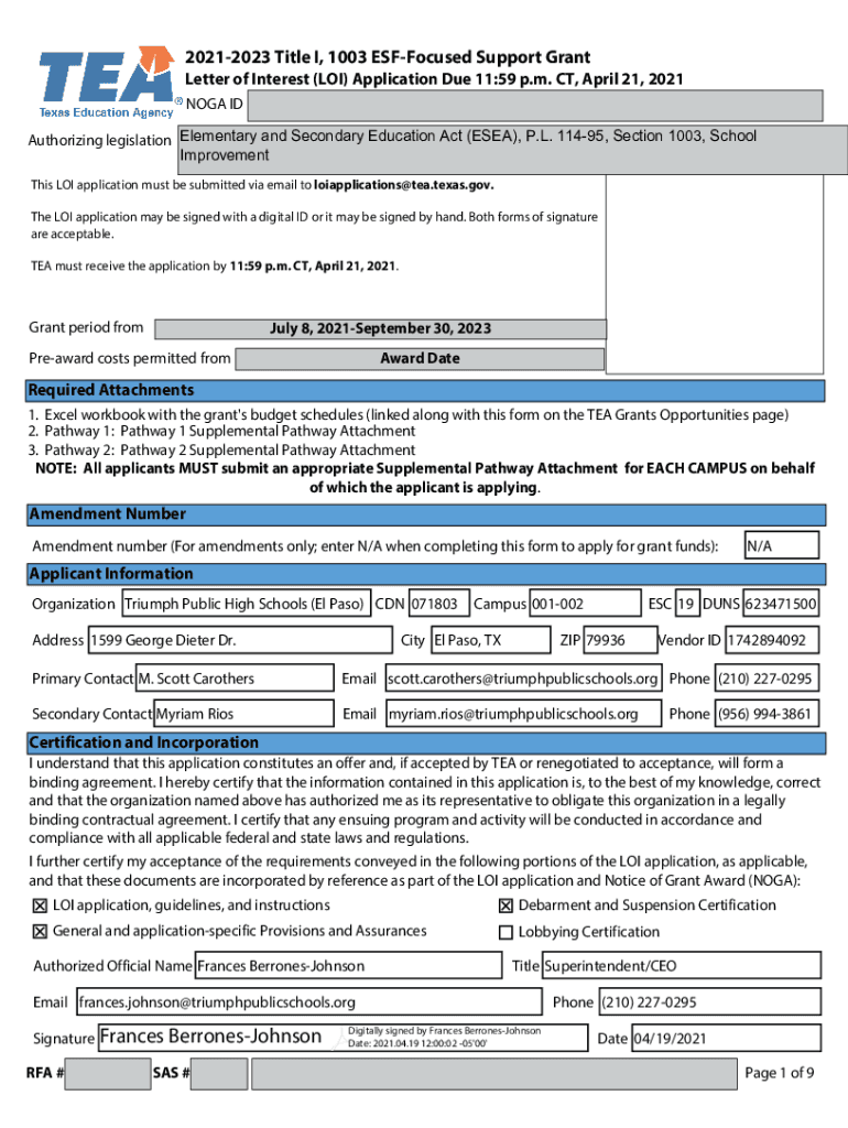 20212023 Title I, 1003 Focused Support GrantLetter of Interest (LOI) Application Due 11:59 p.m. CT, April 21, 2021, NOVA ID Authorizing legislation Elementary and Secondary Education Act (SEA), P.L.