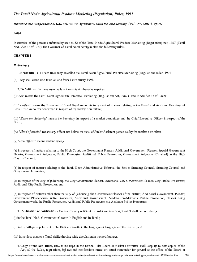 The Tamil Nadu Agricultural Produce Marketing (Regulation) Rules, 1991 Published vide Notification No. G.O. Ms. No. 40, Agriculture, dated the 23rd January 1991 No. SRO A9(b)/91 tn048 In exercise