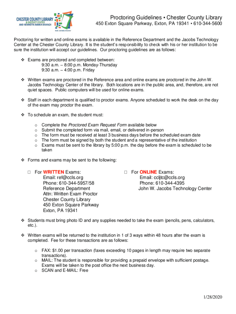 Proctoring Guidelines Chester County Library 450 Eaton Square Parkway, Eaton, PA 19341 6103445600Proctoring for written and online exams is available in the Reference Department and the Jacobs Technology