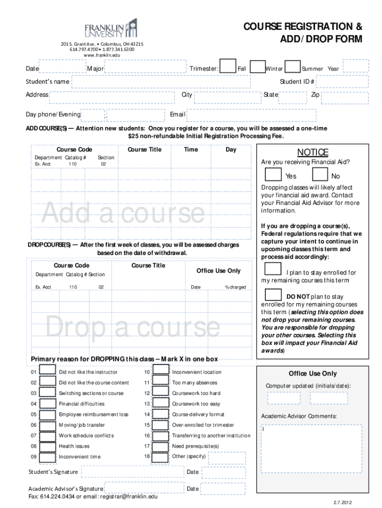 COURSE REGISTRATION & ADD/DROP FORM201 S. Grant Ave. Columbus, OH 43215 614.797.4700 1.877.341.6300 www.franklin.eduDateTrimester: Major ___Fall Students name ___ Address ___ Day phone/Evening (___