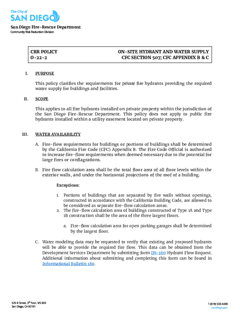 San Diego FireRescue Department Community Risk Reduction Division CRR POLICY O222 I.ONSITE HYDRANT AND WATER SUPPLY CFC SECTION 507; CFC APPENDIX B & PURPOSE This policy clarifies the requirements