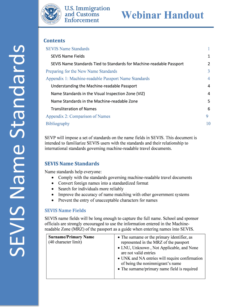 SEVISNameStandardsWebinar HandoutContentsSEVIS Name Standards1SEVISNameFields1SEVISNameStandardsTiedtoStandardsforMachinereadablePassport2Preparing for the New Name Standards3Appendix 1: Machine readable