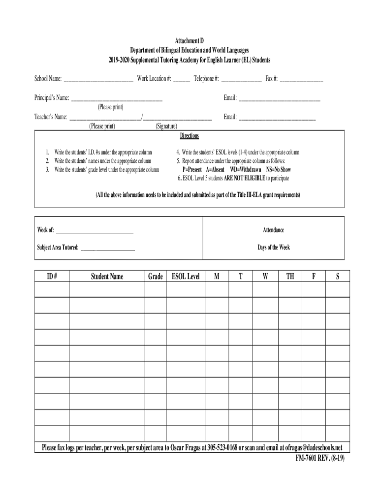 Attachment D Department of Bilingual Education and World Languages 20192020 Supplemental Tutoring Academy for English Learner (EL) Students School Name: ___ Work Location #: ___ Telephone #: ___ Fax