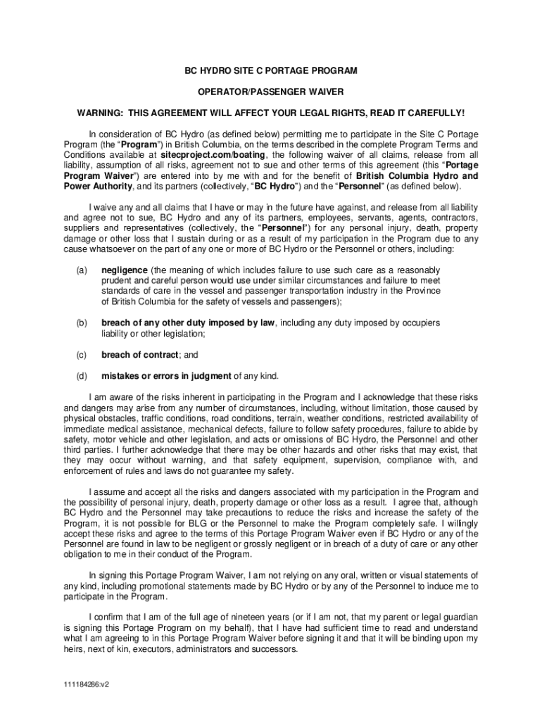 BC HYDRO SITE C PORTAGE PROGRAM OPERATOR/PASSENGER WAIVER WARNING: THIS AGREEMENT WILL AFFECT YOUR LEGAL RIGHTS, READ IT CAREFULLY! In consideration of BC Hydro (as defined below) permitting me to