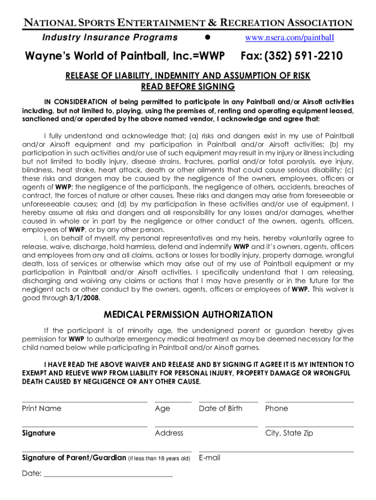 NATIONAL SPORTS ENTERTAINMENT & RECREATION ASSOCIATION Industry Insurance ProgramsWaynes World of Paintball, Inc.WWPwww.nsera.com/paintballFax: (352) 5912210RELEASE OF LIABILITY, INDEMNITY AND ASSUMPTION