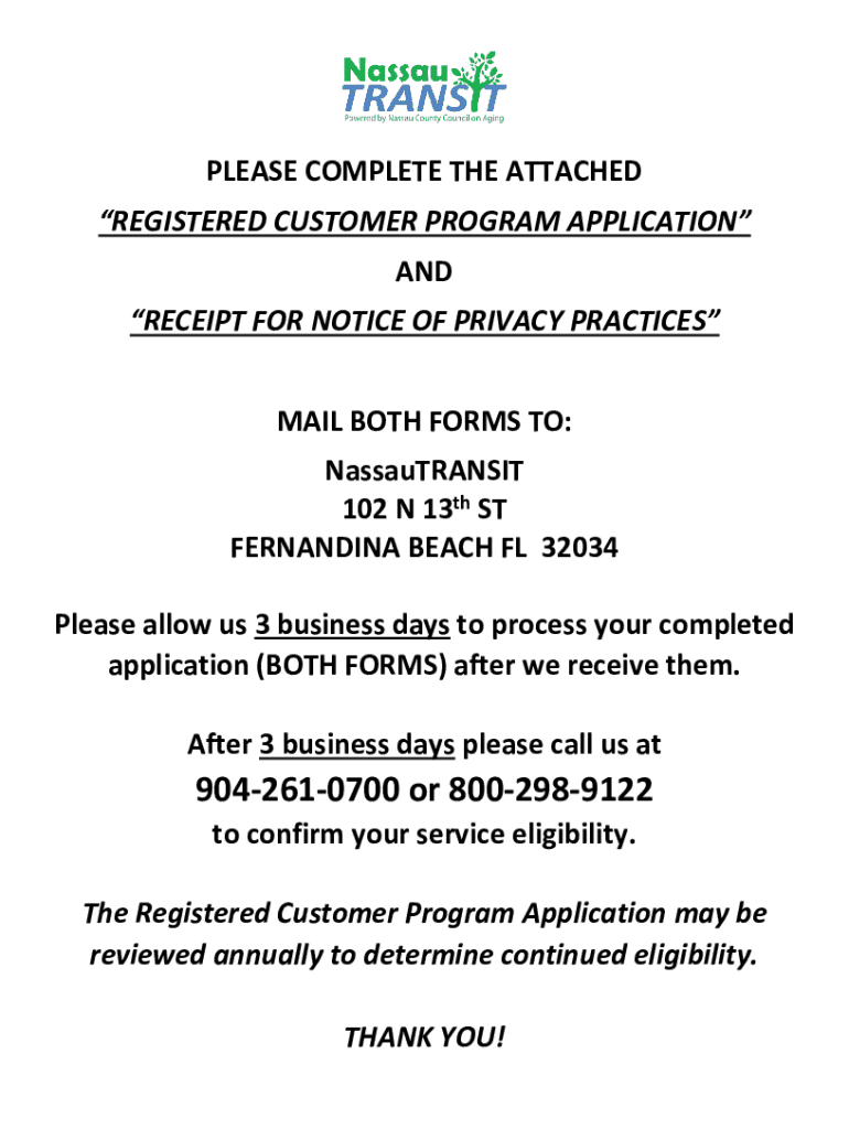 PLEASE COMPLETE THE ATTACHED REGISTERED CUSTOMER PROGRAM APPLICATION AND RECEIPT FOR NOTICE OF PRIVACY PRACTICES MAIL BOTH FORMS TO: NassauTRANSIT 102 N 13th ST FERNANDINA BEACH FL 32034 Please allow