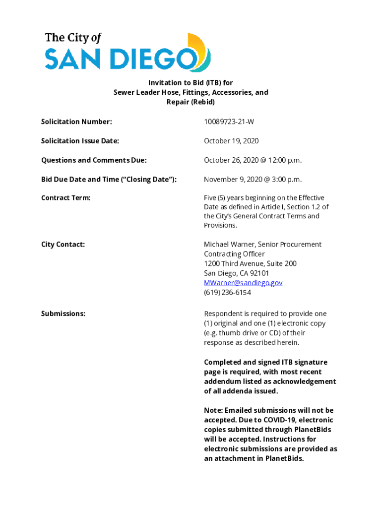 The City/SAND IEG Invitation to Bid (ITB) for Sewer Leader Hose, Fittings, Accessories, and Repair (Rebid) Solicitation Number:1008972321WSolicitation Issue Date:October 19, 2020Questions and Comments