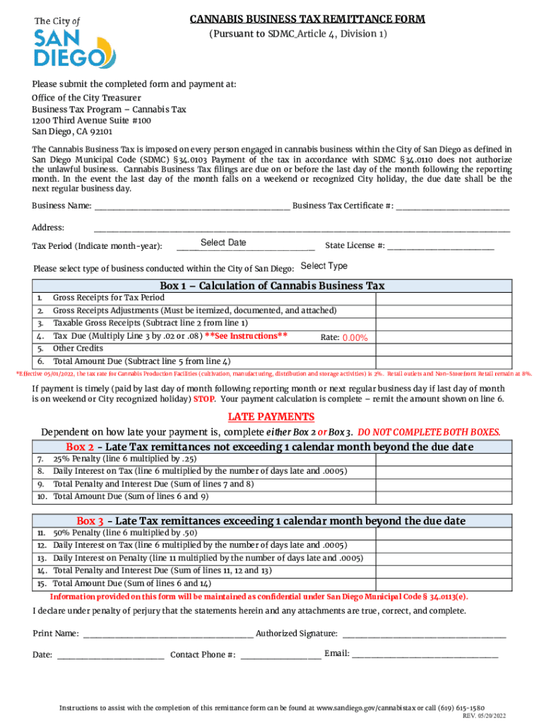 CANNABIS BUSINESS TAX REMITTANCE Forth City of(Pursuant to DMC Article 4, Division 1)SANTIAGO]) Please submit the completed form and payment at: Office of the City Treasurer Business Tax Program Cannabis