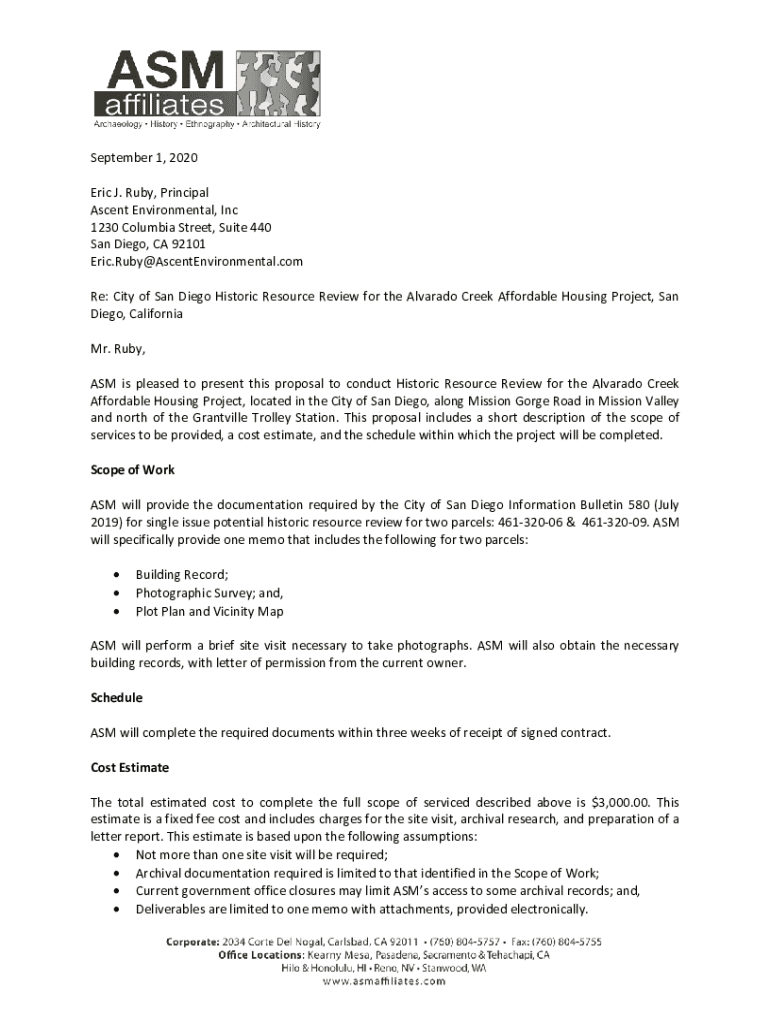 Archaeology History Ethnography Architectural History September 1, 2020, Eric J. Ruby, Principal Ascent Environmental, Inc 1230 Columbia Street, Suite 440 San Diego, CA 92101 Eric.Ruby@AscentEnvironmental.com