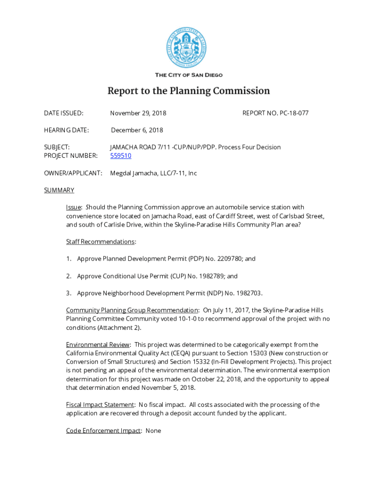 DATE ISSUED:November 29, 2018REPORT NO. PC18077HEARING DATE:December 6, 2018SUBJECT: PROJECT NUMBER:JAMAICA ROAD 7/11 CUP/UP/PDP. Process Four Decision 559510OWNER/APPLICANT:Medal Jamaica, LLC/711,