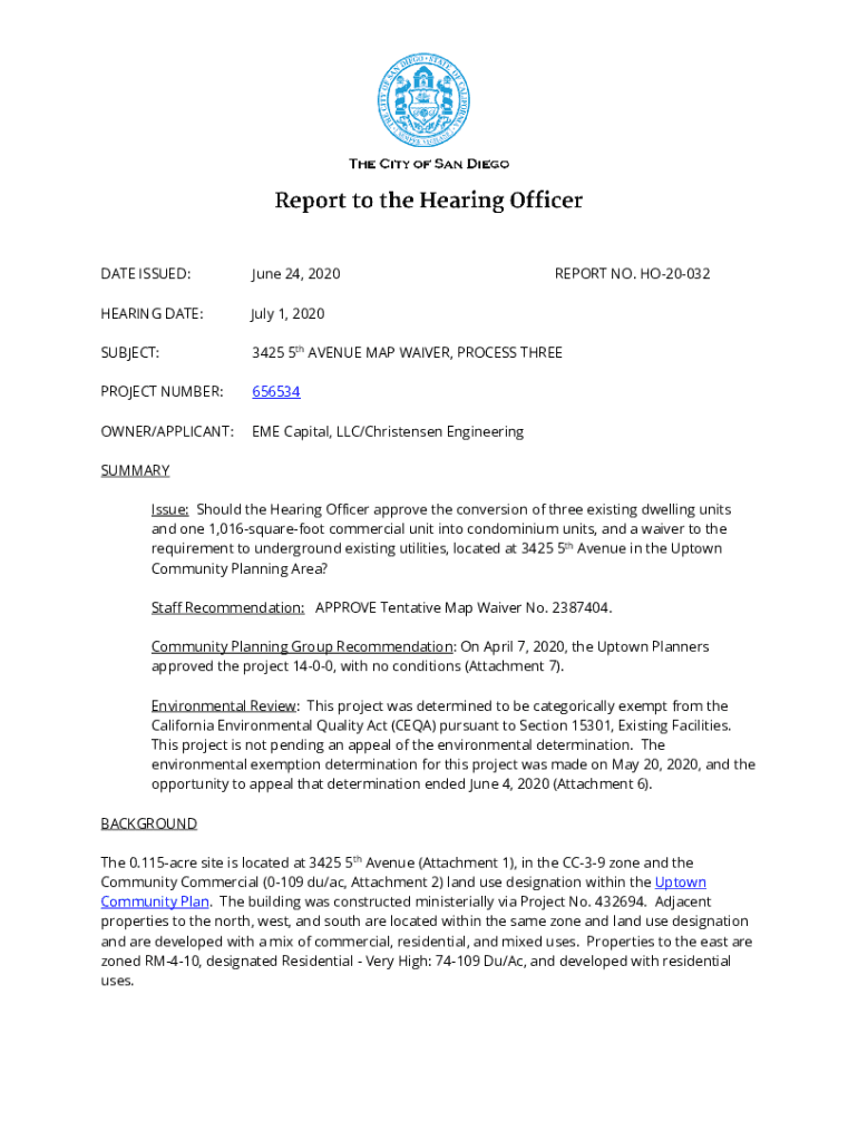THE CITY OF SAN DIEGOReport to the Hearing Officer DATE ISSUED:June 24, 2020REPORT NO. HO20032HEARING DATE:July 1, 2020SUBJECT:3425 5th AVENUE MAP WAIVER, PROCESS THREEPROJECT NUMBER:656534OWNER/APPLICANT:EME