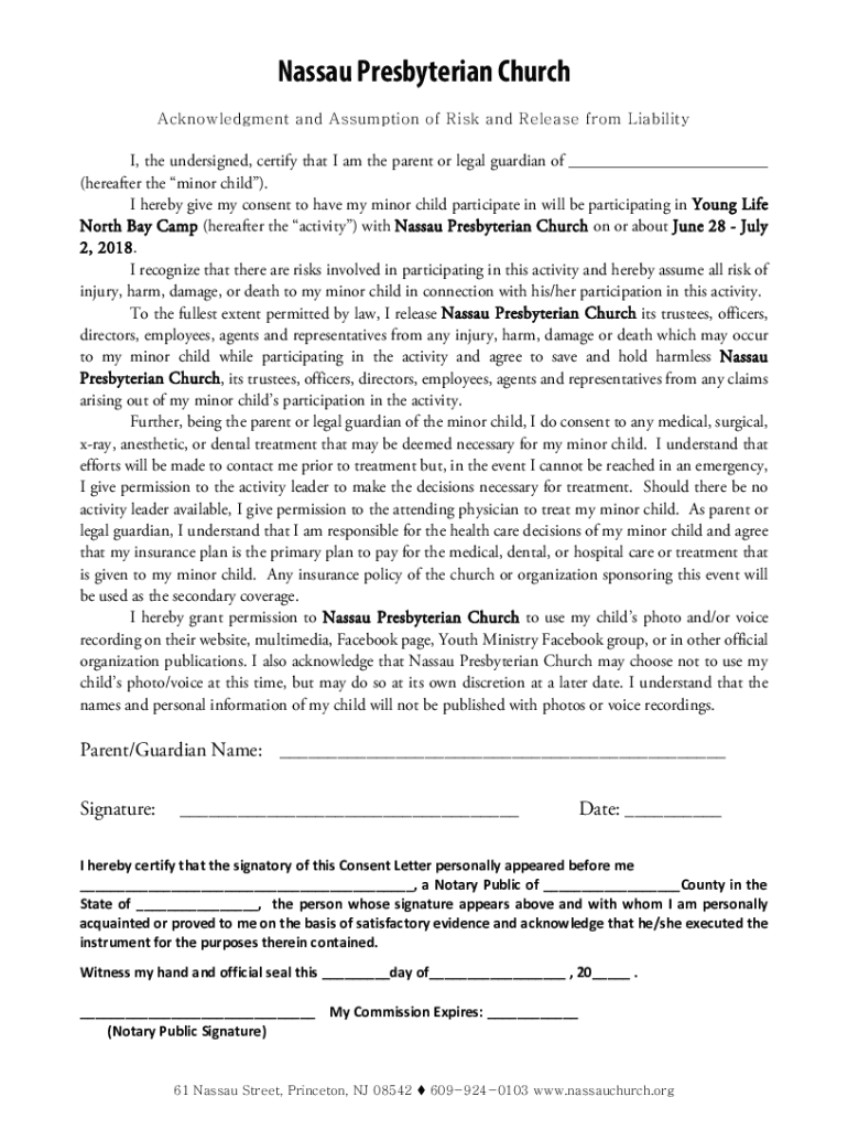 Nassau Presbyterian Church Acknowledgment and Assumption of Risk and Release from Liability, the undersigned, certify that I am the parent or legal guardian of ___ (hereafter the minor child). I hereby