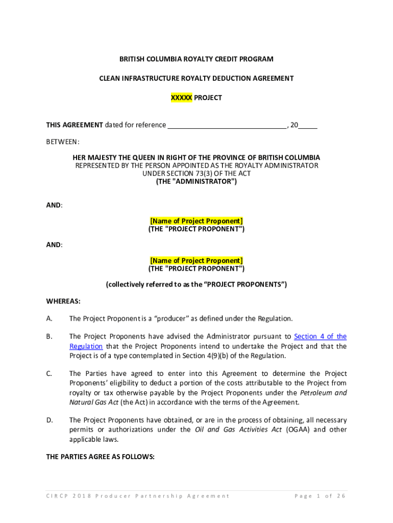 BRITISH COLUMBIA ROYALTY CREDIT PROGRAM CLEAN INFRASTRUCTURE ROYALTY DEDUCTION AGREEMENT XXXIX PROJECT THIS AGREEMENT dated for reference ___, 20___ BETWEEN: HER MAJESTY THE QUEEN IN RIGHT OF THE