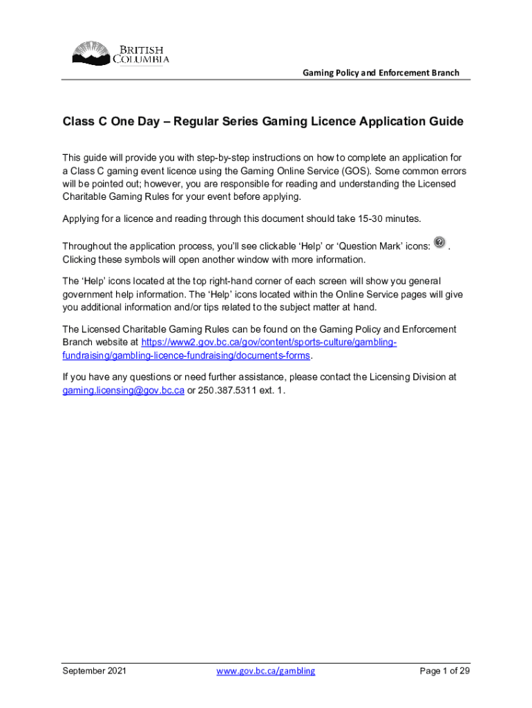 Gaming Policy and Enforcement BranchClass C One Day Regular Series Gaming License Application Guide This guide will provide you with stepsister instructions on how to complete an application for a
