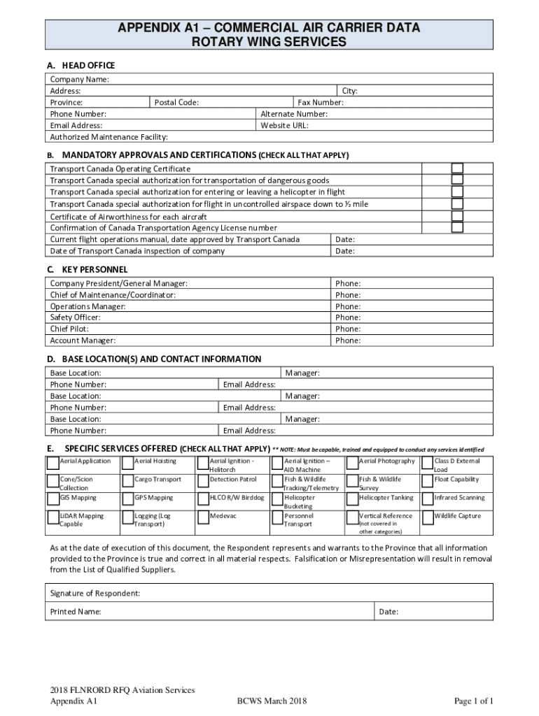 APPENDIX A1 COMMERCIAL AIR CARRIER DATA ROTARY WING SERVICES A. HEAD OFFICE Company Name: Address: Province: Postal Code: Phone Number: Email Address: Authorized Maintenance Facility:City: Fax Number: