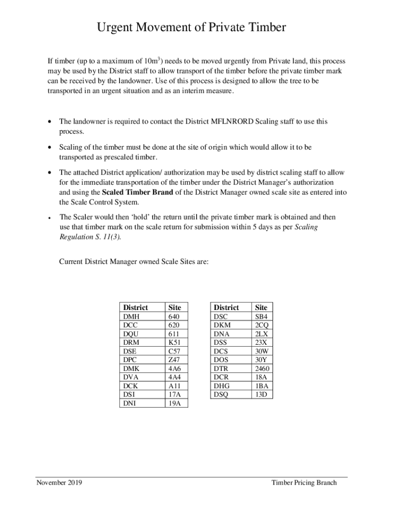Urgent Movement of Private Timber If timber (up to a maximum of 10m3) needs to be moved urgently from Private land, this process may be used by the District staff to allow transport of the timber