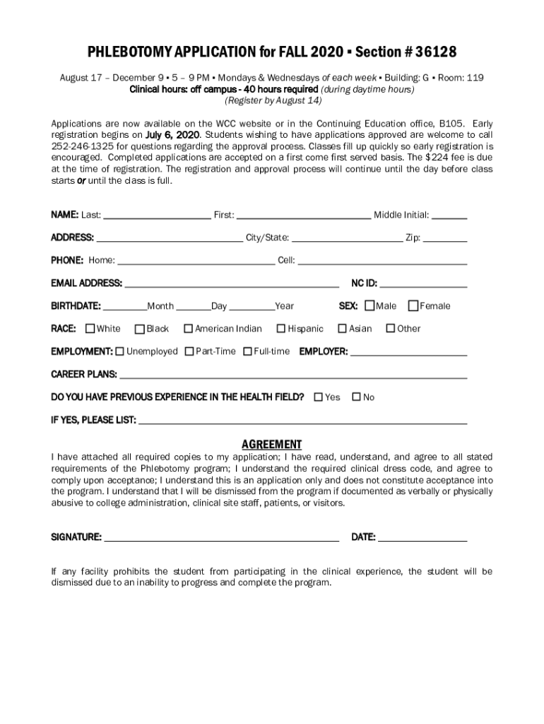 PHLEBOTOMY APPLICATION FALL 2020 Admission into the Phlebotomy program for FALL 2020 is by application, and only completed applications will be accepted. There are fifteen (15) spaces available. Applicants