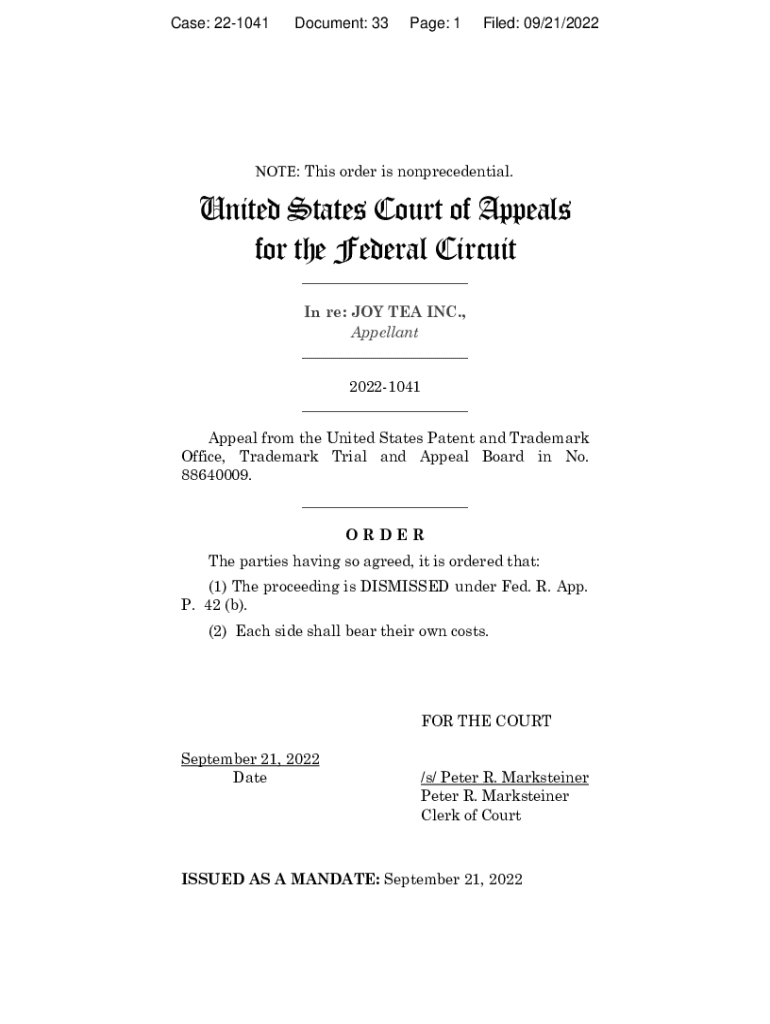 Case: 221041Document: 33Page: 1Filed: 09/21/2022NOTE: This order is nonresidential. United States Court of Appeals for the Federal Circuit ___ In re: JOY TEA INC., Appellant ___ 20221041 ___ Appeal