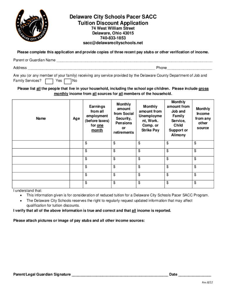 Get the free Delaware City Schools Pacer SACC Tuition Discount Application