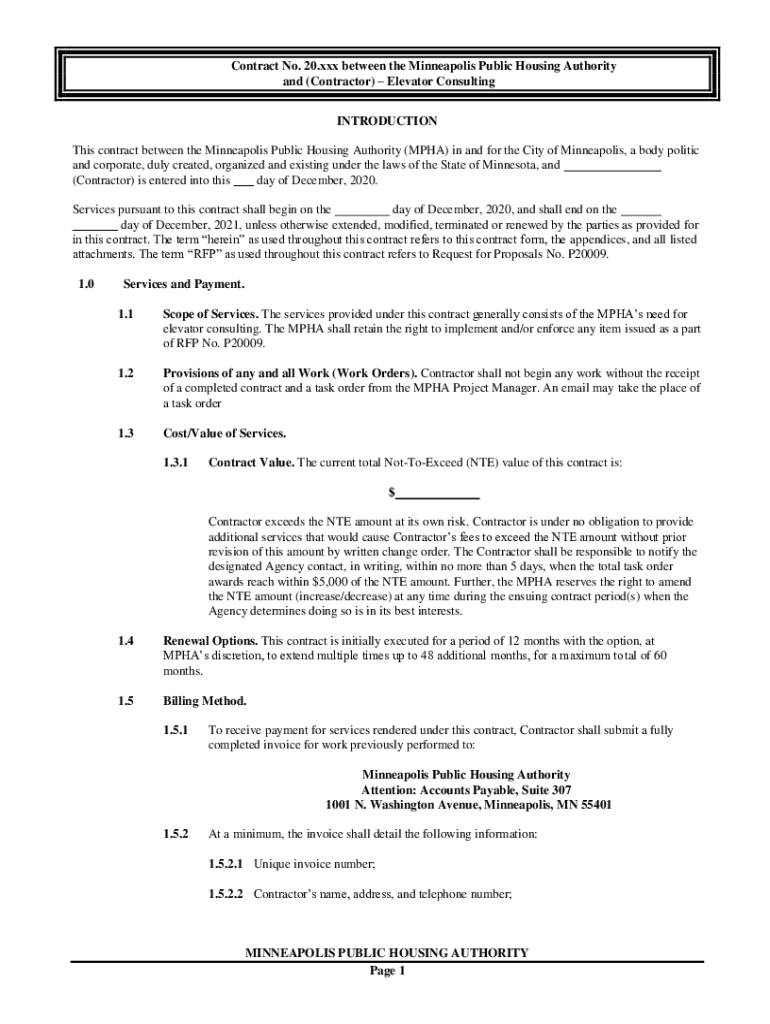 Contract No. 20.xxx between the Minneapolis Public Housing Authority and (Contractor) Elevator Consulting INTRODUCTION This contract between the Minneapolis Public Housing Authority (MPH) in and for