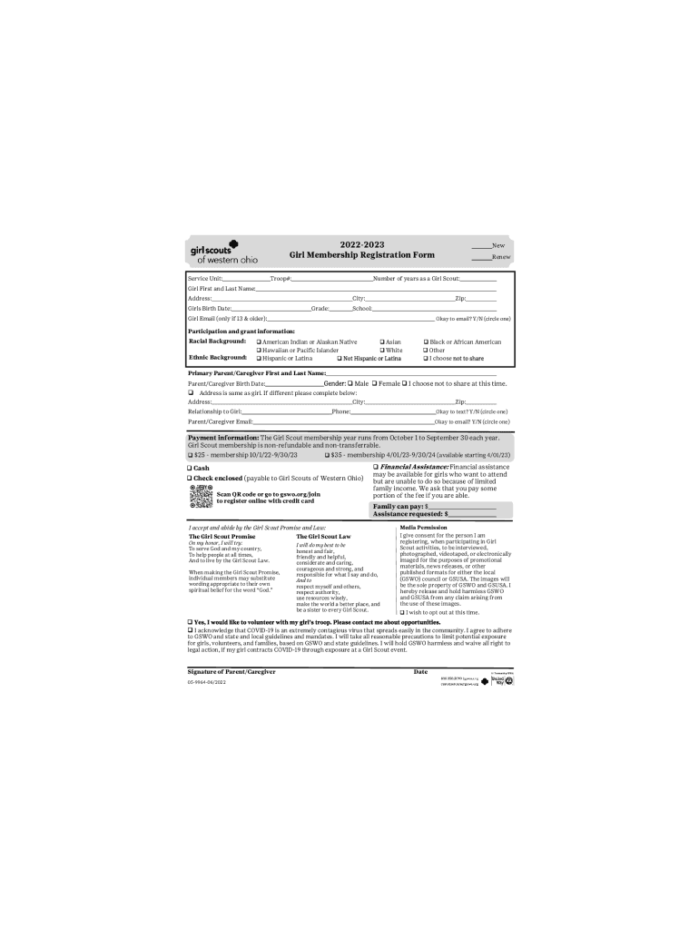 20222023 Girl Membership Registration Form Service Unit:Troop#:NewRenewNumber of years as a Girl Scout:Girl First and Last Name: Address:City:Girls Birth Date:Grade:Zip:School:Girl Email (only if