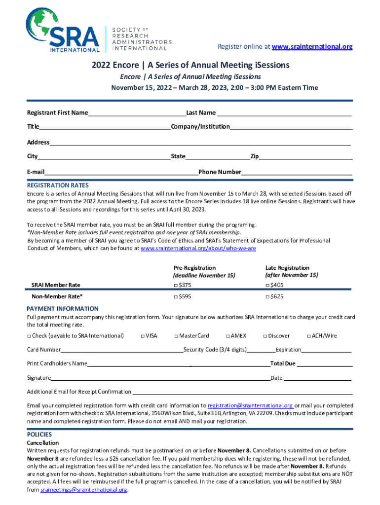 Register online at www.srainternational.org2022 Encore | A Series of Annual Meeting iSessionsEncore | A Series of Annual Meeting sessions November 15, 2022, March 28, 2023, 2:00 3:00 PM Eastern TimeRegistrant